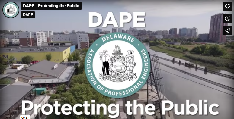 The Delaware Association of Professional Engineers (DAPE) was created through Delaware Code Title 24 Chapter 28 in 1972. DAPE is a self-regulated professional licensing board, established to safeguard life, health, and property and to promote public welfare, through a high standard of integrity, skills, and practice in the profession of engineering. DAPE’s Council establishes the qualifications and evaluates individual and firm candidates for Professional Engineer licensure in the State of Delaware.